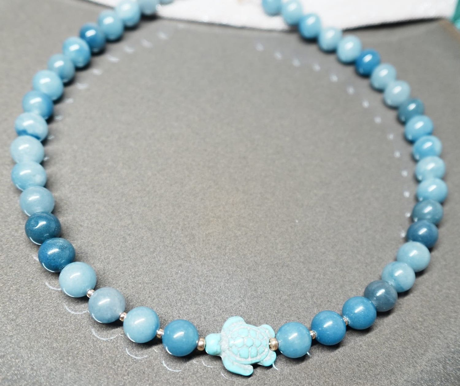 Bring calm ocean energy wherever you go with this Handmade Blue Aventurine Necklace featuring a Turtle Charm. The serene blue tones of the natural aventurine gemstone are paired with a detailed turtle pendant, symbolizing wisdom, peace, and longevity.