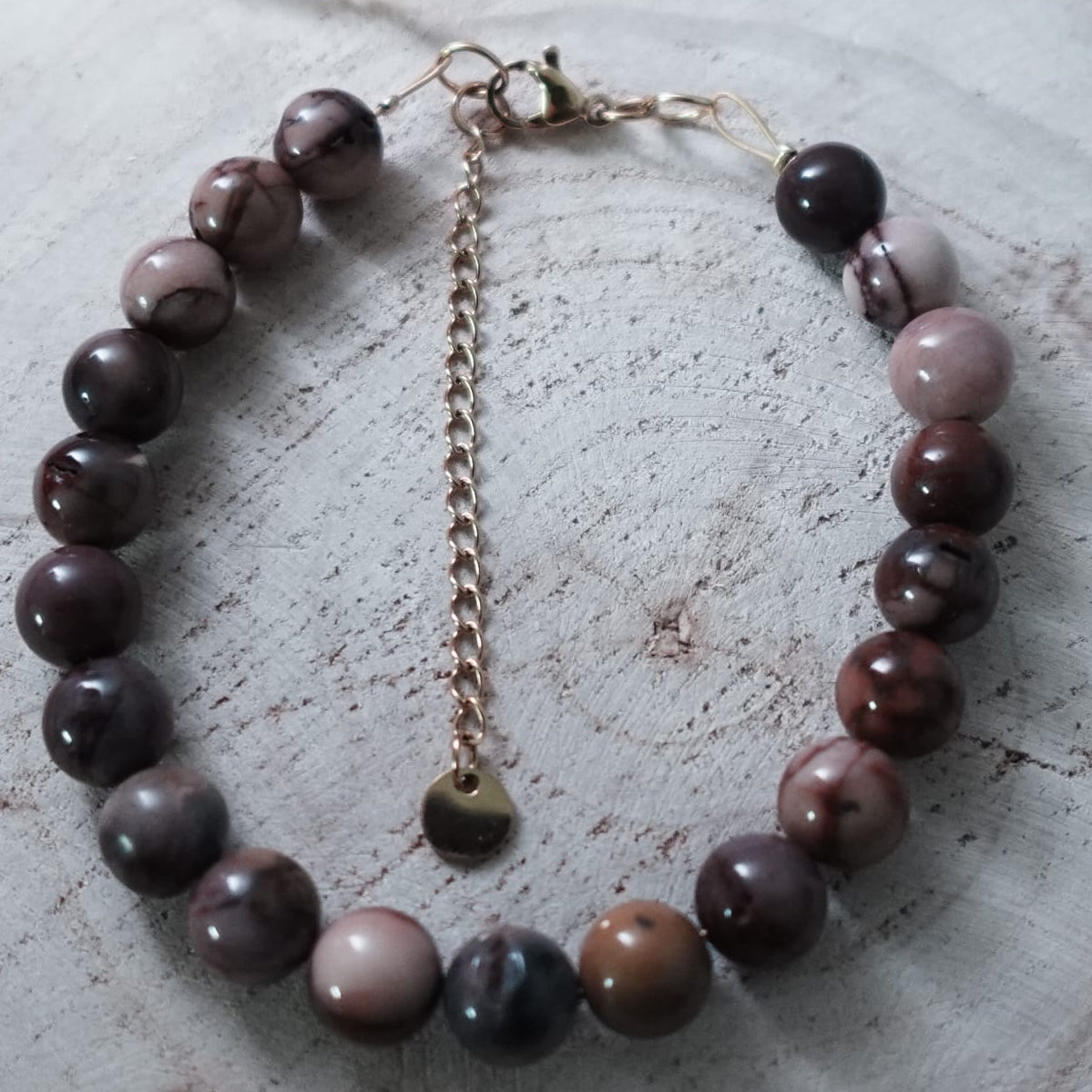 This handmade Jasper round jasper beads (approx. 8 mm) in soft natural shades—beige,taupe, gray, and brown. Each stone is unique, showcasing subtle patterns and earthy charm.Finished with a Stainless Steel extender chain and charm for a refined touch. Jasper is known as a grounding and protective stone. Wear it as a daily reminder of inner strength, balance,and serenity.