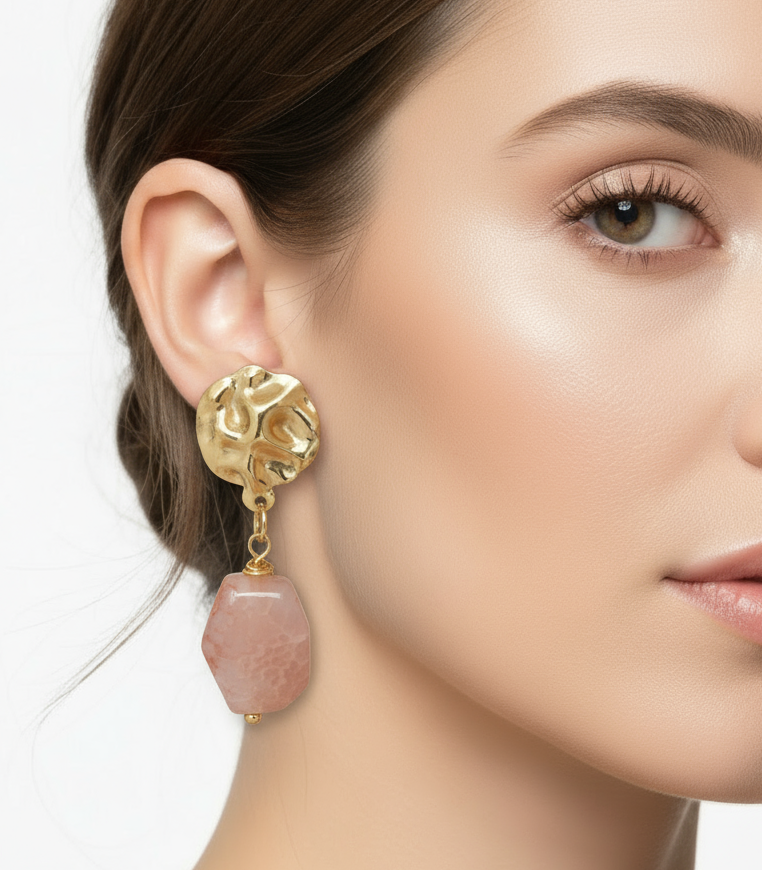 Natural Stone Agate Peachy Orange Earrings | Stainless Steel Textured Hoops | Handmade Gemstone Jewelry