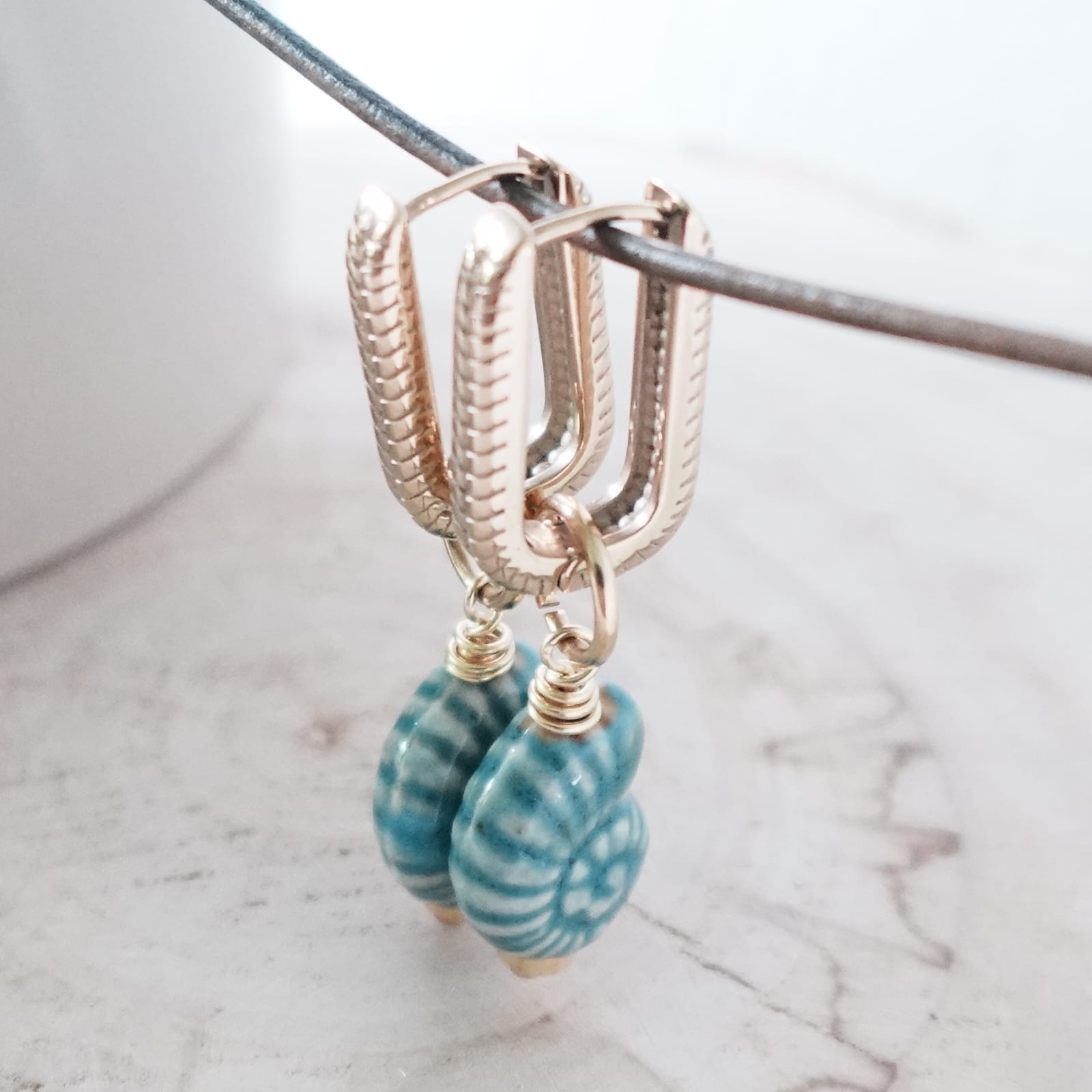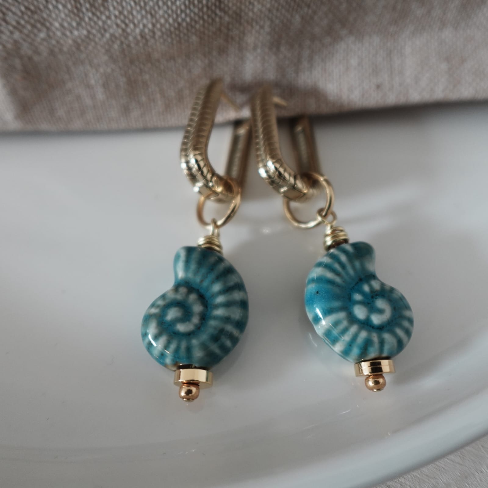 Blue Ceramic Ammonite Fossil Drop Earrings | Handmade Boho Jewelry | Ocean-Inspired Design