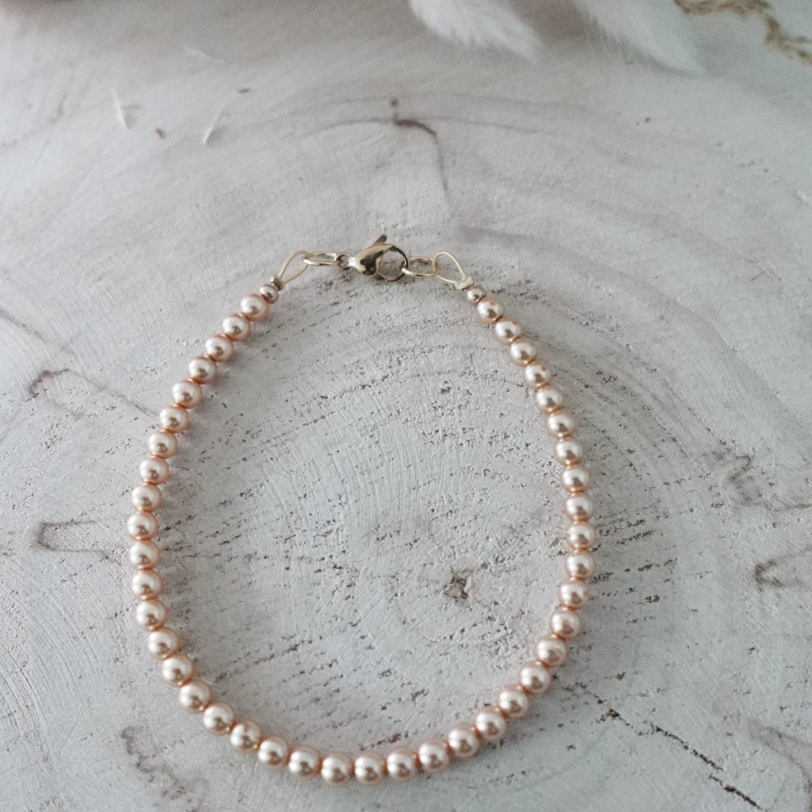 This handmade bracelet is composed of Preciosa pearls, perfectly round and even in size. The pearls are strung on gold wire and finished with a stainless steel lobster clasp.