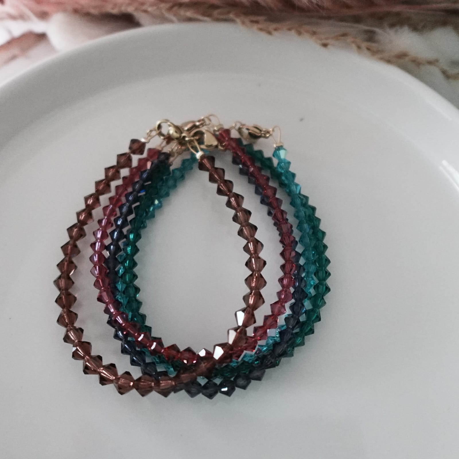 This handmade bracelet features 4 mm Preciosa Bicone crystal beads in divers —colors a rich, transparent green reminiscent of freshly cut gemstones. The faceted bicones catch the light from every angle, creating a subtle shimmer. Finished with a Stainless Steel clasp closure.