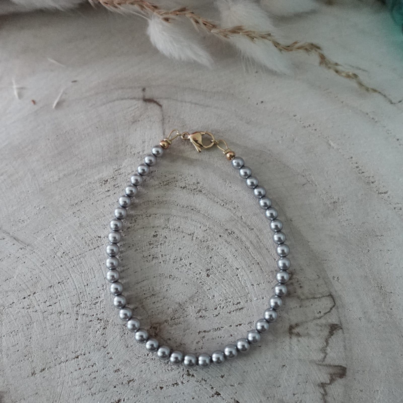 This handmade bracelet is composed of Preciosa pearls, perfectly round and even in size. The pearls are strung on gold wire and finished with a stainless steel lobster clasp.
